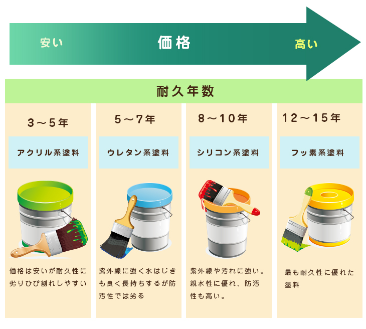 外壁塗装でよく使用される塗料は下記の4種類です。右にいくほど高価になりますが、その分耐用年数も長くはなります。初期費用を気にされますが、、長期的に見れば耐久性に優れた塗料を使って塗り替え回数を少なくした方が安上がりになるという事を、是非覚えていて下さい。